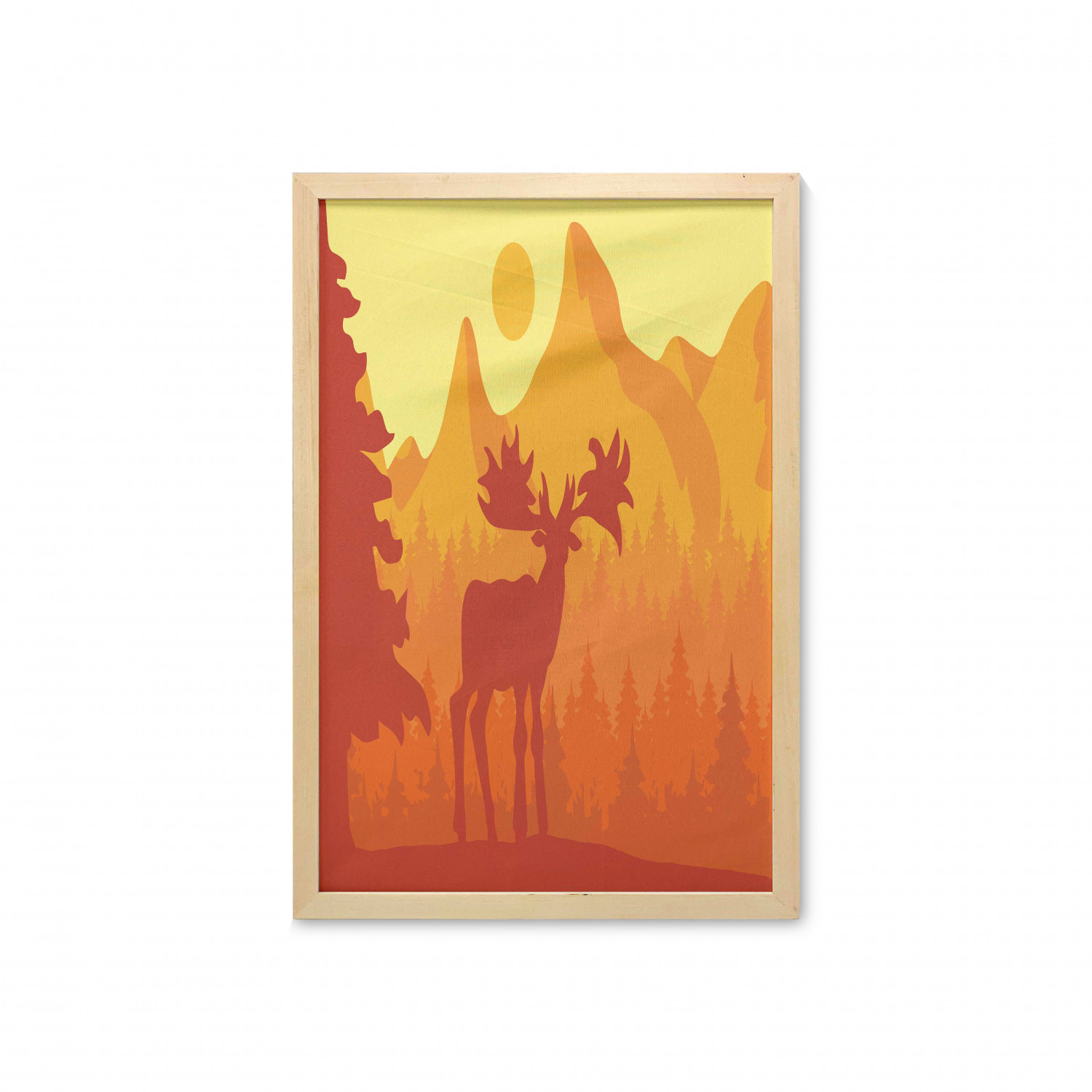 Elk Wall Art With Frame Silhouette Of Wapiti Deer Mountain Trees Sun Natural Reserve Area Printed Fabric Poster For Bathroom Living Room Dorms 23 X 35 Vermilion Orange And Mustard By Ambesonne